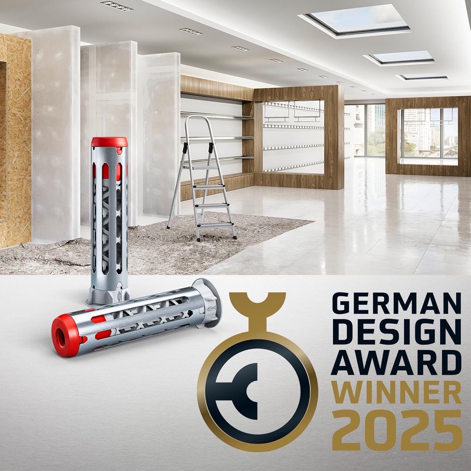 - Instalación sencilla: con tornillo TX para un montaje rápido y fiable. En el montaje previo, el casquillo de metal se pliega detrás del material de construcción y se presiona contra la parte posterior de la placa, mientras que el taco de plástico se extiende en el material de construcción, el montaje se realiza rápida y fácilmente mediante un destornillador inalámbrico, lo que reduce el tiempo de montaje hasta un 50% en comparación con los tacos convencionales.
