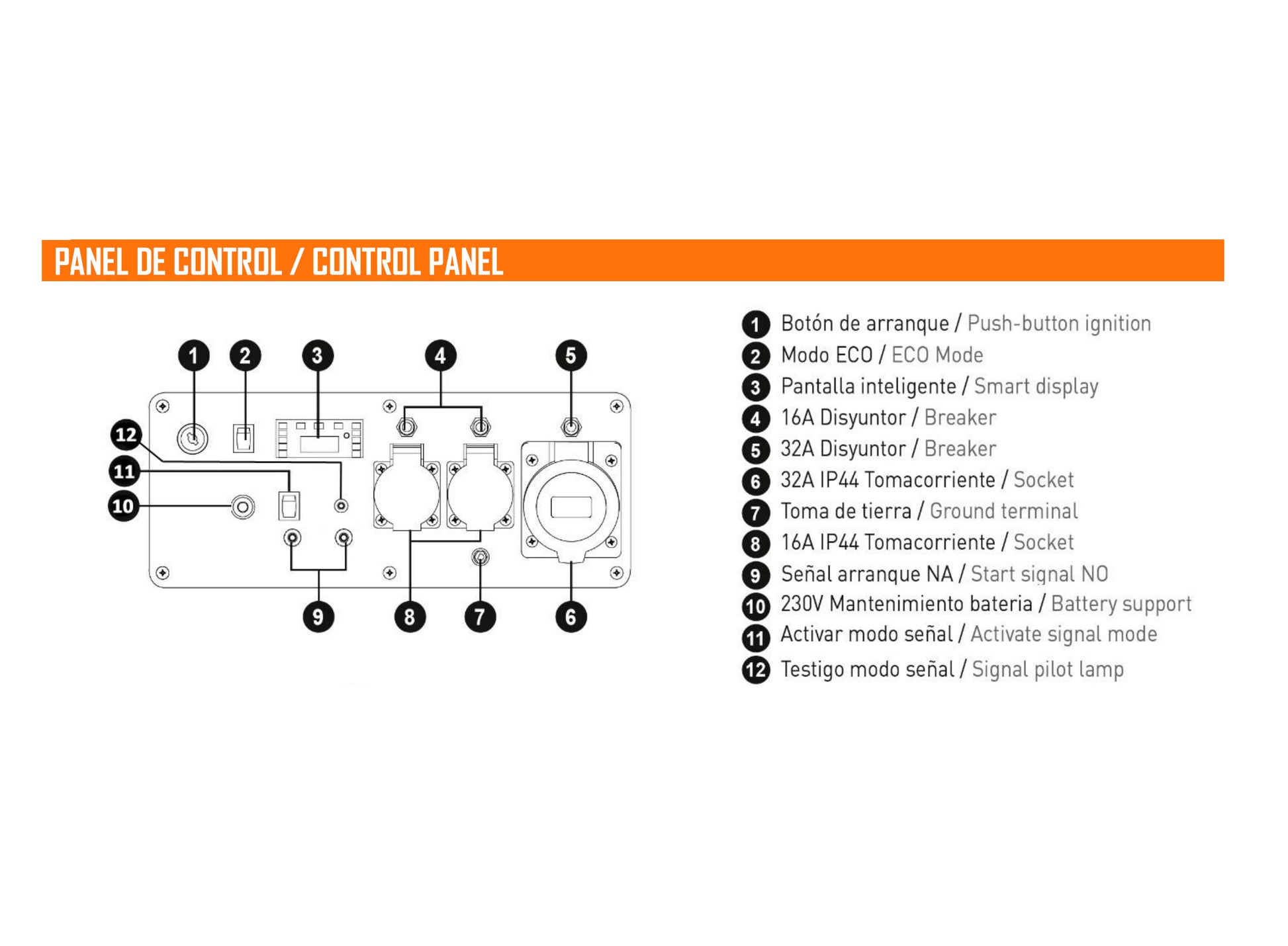 • Pantalla digital inteligente: informa sobre voltaje, frecuencia, horas de uso, combustible y estado de carga de baterías; también señala cuándo hacer mantenimiento.