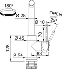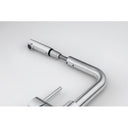 Grifo de cocina Glenda Pull-Out Inox, altura total de 300 mm, con maneta lateral, aireador laminar, caño extraíble y mecanismo cerámico. Este grifo tiene una rotación del caño de 180º y la apertura de la maneta es de 90º.