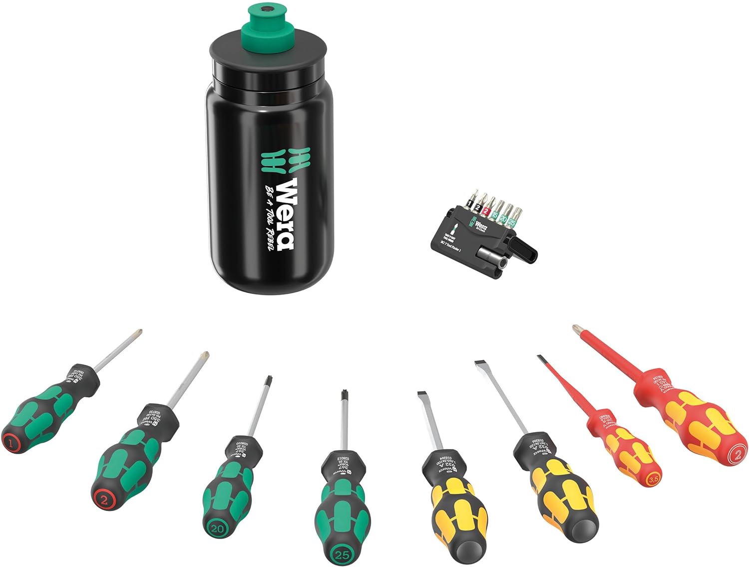 Juego de herramientas de atornillar de 17 piezas con bidón para beber rellenable Elite Fly. Un juego general para los perfiles comunes Phillips, Pozidriv, ranura y TORX®. Contiene diferentes clases de herramientas: un destorcincel para atornillar, cincelar y escoplar. Destornilladores VDE Schraubendreher para trabajar bajo tensión eléctrica así como destornilladores para el taller. Puntas BiTorsion y adaptadores de puntas para trabajos de atornillar con máquina atornilladora. Con un bidón de alta calidad y superligero de Elite en el diseño de Wera. Es perfectamente adecuado para actividades en la naturaleza, y cabe en todos los soportes comunes para bidones de bicicletas.