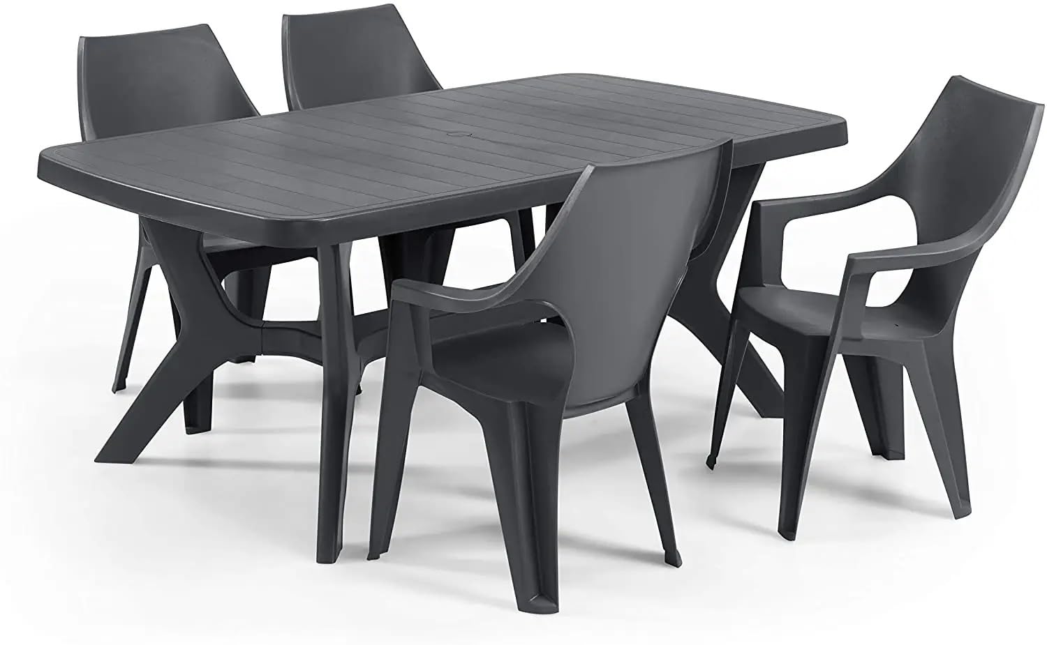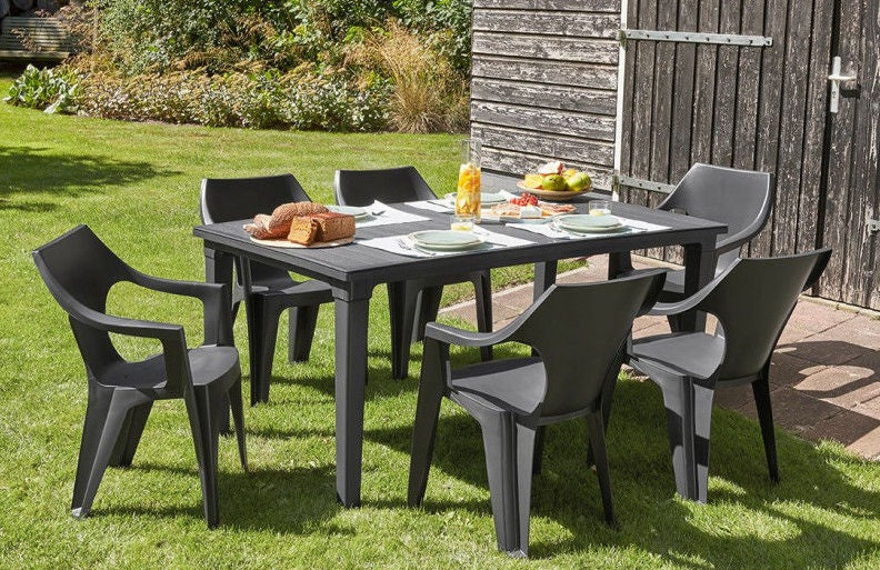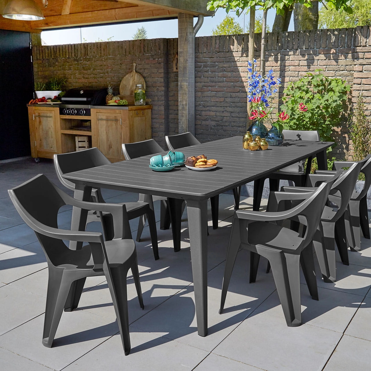 - Versátil y combinable: Su diseño neutro en color grafito combina fácilmente con cualquier tipo de mesa para exteriores o mobiliario de jardín.