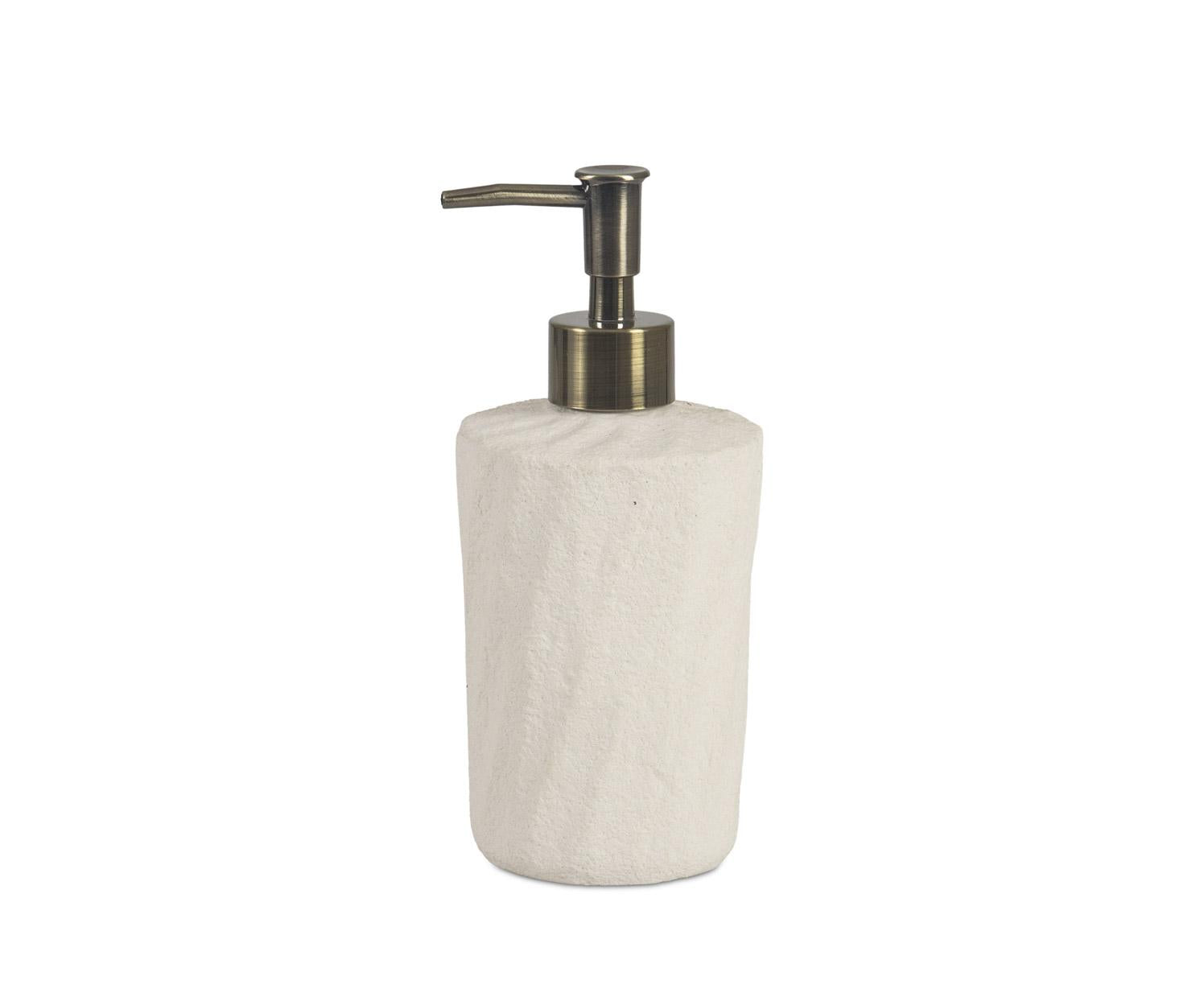 Eleganter Badezimmer-Seifenspender aus Keramik im Farbton Beige Sand mit sandiger Textur, inspiriert von natürlichen Formen, entwickelt, um Flüssigseife stilvoll und funktional zu dosieren. Ideal zur Ergänzung des Badezimmer-Accessoire-Sets mit einer ruhigen und zeitgemäßen Note.