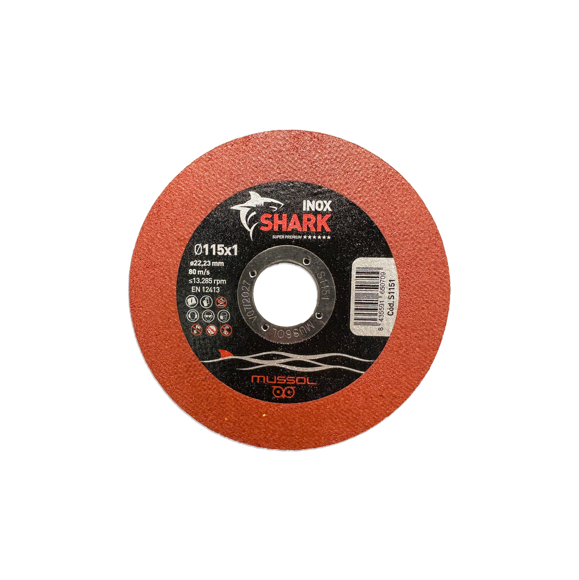 Schneidscheibe für Edelstahl und Stahl im Allgemeinen, frei von Eisen, Schwefel und Chlor, entwickelt für hohe Schnittgeschwindigkeit, saubere extrafeine Schnitte und hervorragende Lebensdauer unter anspruchsvollen Bedingungen. Sie ist die „Shark“-Variante innerhalb der Inox-Reihe von Mussol.